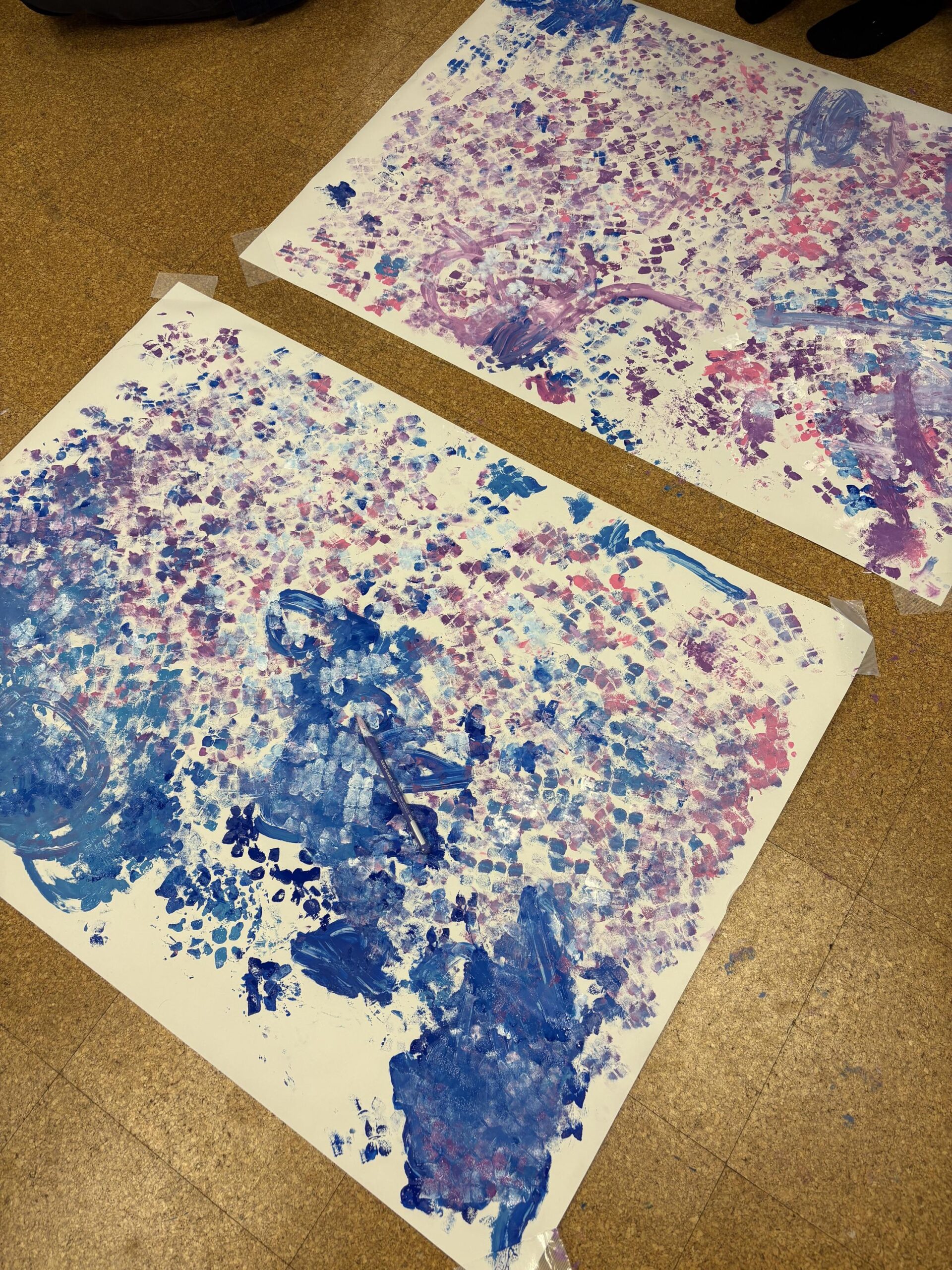 ピンク・水色・紫・青の絵の具を付けたスタンプで真っ白な模造紙をきれいに埋めてくれました!